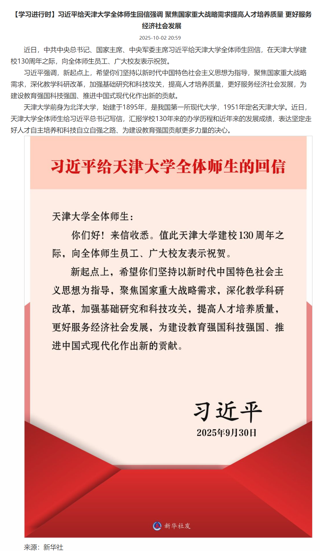 【学习进行时】习近平给天津大学全体师生回信强调 聚焦国家重大战略需求提高人才培养质量 更好服务经济社会发展